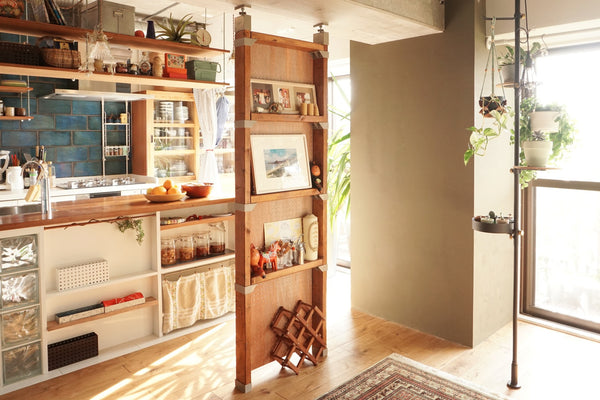 Make an open-air partition by installing several Labrico columns in a row, then installing shelves or panels to divide the space in a way that's uniquely you.